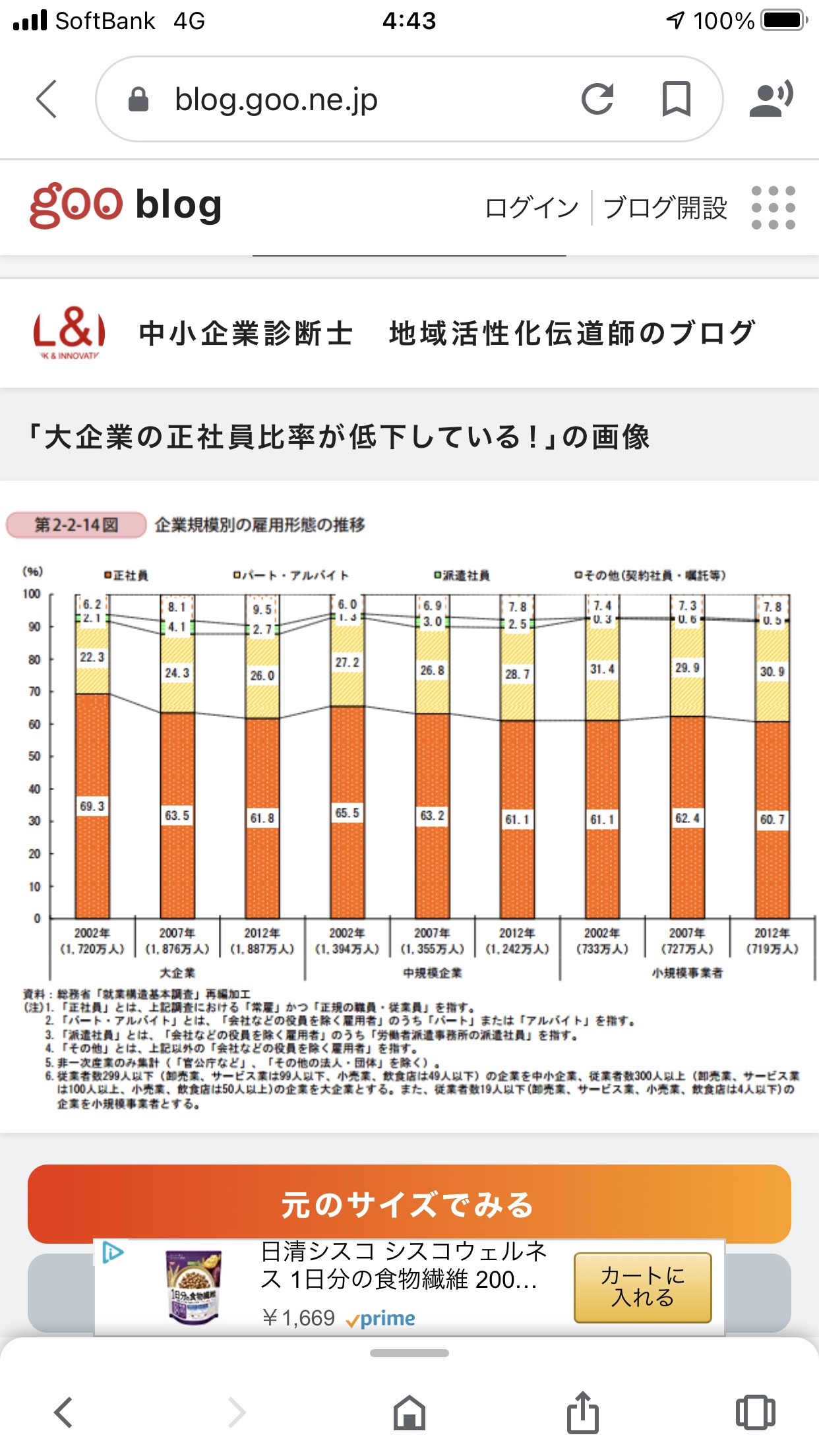 - 正社員のうちで絞ると15%くらいなんだな大企業比率。だいたい大卒なら3割くらいが