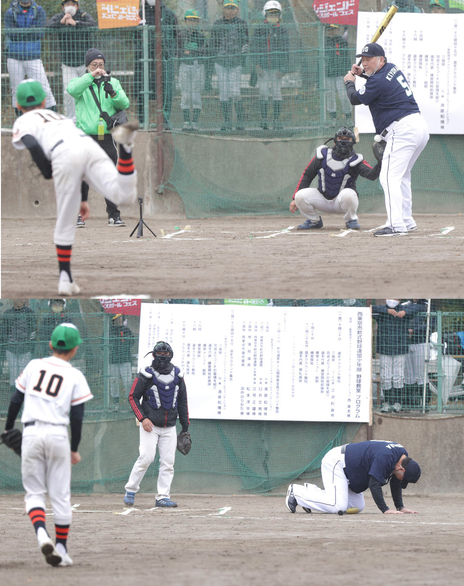 小学生投手7人と対戦して1安打。4打席目にはぽっこりと出たお腹にデッドボールを当てられて転がり、苦笑い。さらには、巨人・菅野そっくりの投球フォームから投げる投手の投球練習中には、打席を外していたのにも関わらず腰付近に当てられ、「菅野、デッドボール当てるなよ!」と場を盛り上げた。