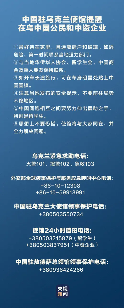 【在乌中国公民紧急求助电话!在乌中国公民可在车身明显处贴国旗】今天,中国驻乌克兰大使馆提醒在乌中国公民和中资企业: