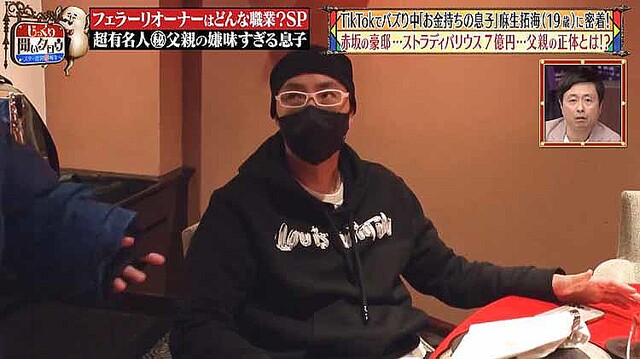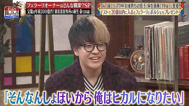 かつて番組に出演したこともある「東京美容外科」統括院長・麻生泰先生だった! 現在、全国で18院展開し、「痛くない豊胸手術」で年商200億円以上拓海さんは、現在、歯学部の2年生。大学に近いという理由だけで賃貸ではなく約2000万円の2LDKのマンションを買ってもらった上、テストで20番以内になったらフェラーリかポルシェを買ってやると言われているそう。…だが、まだ20番以内に入ったことはないらしい。さらに、いずれ歯科医になった時のために、すでに赤坂と銀座に病院も作ってあるという。