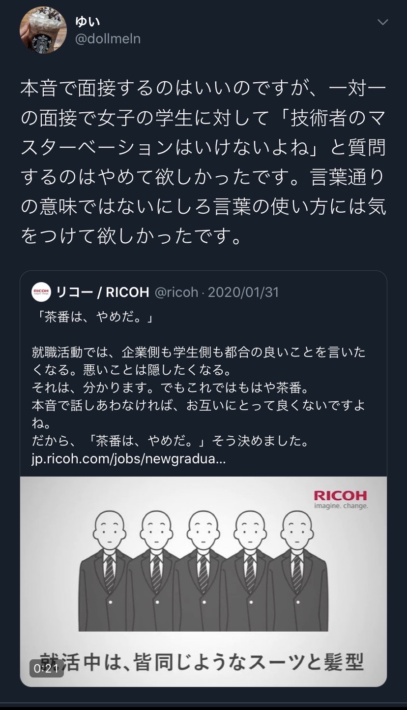 これリコーの面接官が就活生へのセクハラじゃないの? - 34 : 2020/04/16(木) 20:50:57.40 ID:3T1Mg02ga