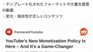 嫌儲youtube「切り抜き・AI音声や顔を出さないナレーション・テンプレ動画・独自性が乏しいコンテンツは収益化対象外になります」