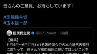嫌儲玉木「高市首相にする質問募集!」ツイッターで呼びかけ
