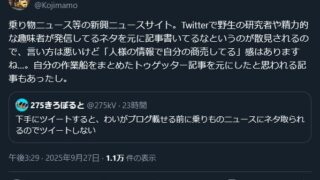 嫌儲何かの専門家「下手にツイートすると乗りものニュースにネタをパクられるのでツイートしない」